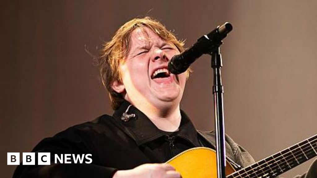 Getty Images Lewis Capaldi sings on a stage into a microphone as he plays a guitar. He has long brown hair and wears a black jacket. His eyes are shut as he performs. Getty Images