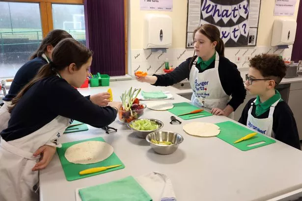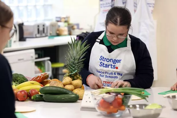 Ferndale Community School staff collect their order from Aberdare Tesco every week. Produce from it goes to the food and nutrition department for cooking lessons as well as the free fruit bowls and breakfast club. At a food and nutrition class, a group of year seven pupils are busy chopping bright piles of peppers, avocado, tomatoes and spring onions for chicken and salad wraps.