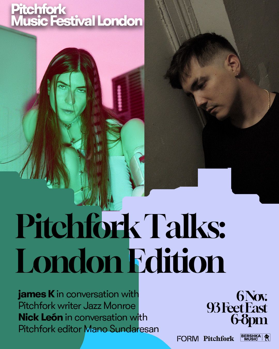 Pitchfork Music Festival London has announced Pitchfork Talks: London Edition, an evening of live conversations with artists on the Pitchfork London lineup. The event features Pitchfork’s Head of Editorial Content, Mano Sundaresan, speaking with Nick León, and Associate Staff Writer Jazz Monroe interviewing James K, in conversations about their breakout 2025 records, which together signify a shift toward new trends in pop and club music. Pitchfork Talks: London Edition is held at 93 Feet East at 6 pm local time on Thursday, November 6. The event is free to attend. Register TIMES.