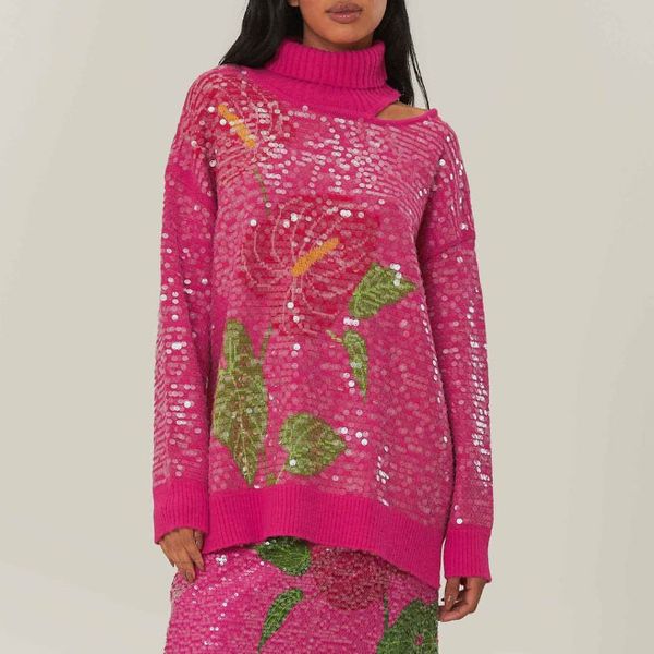 Depart from the typical holiday palette with this bright-pink sequin sweater from Farm Rio. The oversized floral turtleneck features a collarbone slit design and can be paired over the brand’s matching maxi dress for a fun double-sequin set.