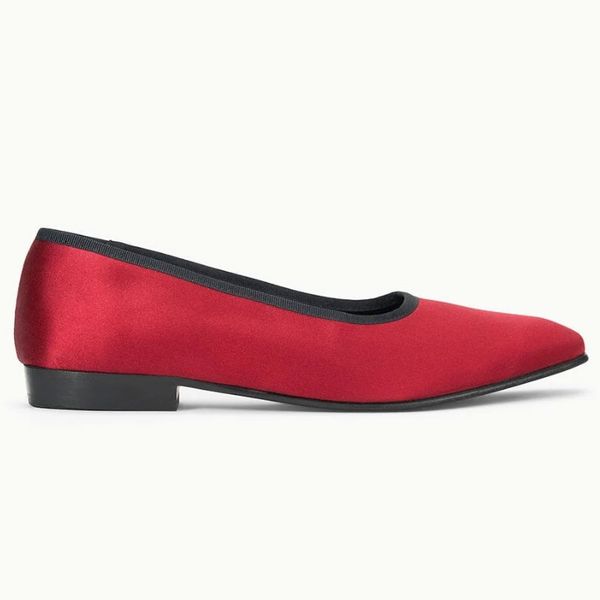 Here, we have another textured flat option, but this time made of fine silk. The holiday red flat features a contrasting grosgrain trim and an elongated square toe.