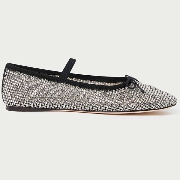 A festive ballet flat for your holiday wardrobe are these allover crystal slip ons from Leoffler Randall. With an elastic bridge strap and tiny bow detail, feel light and comfortable in shoes that you can sparkle all night in.