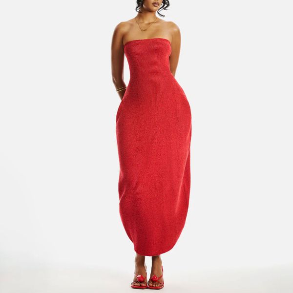 Channel a sexy-chic Mrs. Claus with this Rudolph red knit strapless dress. A special look from Hanifa’s limited holiday collection, the dress features a bubble shaped hem and is made with a two-toned yarn which adds some dimension to the comfy stretch-knit dress.