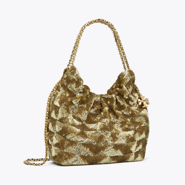 This delicate drawstring chain bag comes in a range of colors and textures, but the eye-catching gold sequin is ideal for the season. Carry it on your shoulder or on your arm, this bag is a glittering addition to any cocktail fit.