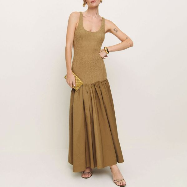 If you like playing with textures, this elegant knit and satin dress is a great option for the holiday season. The drop-waist dress features a voluminous balloon skirt and split-sleeve detail that is playful enough for any occasion.