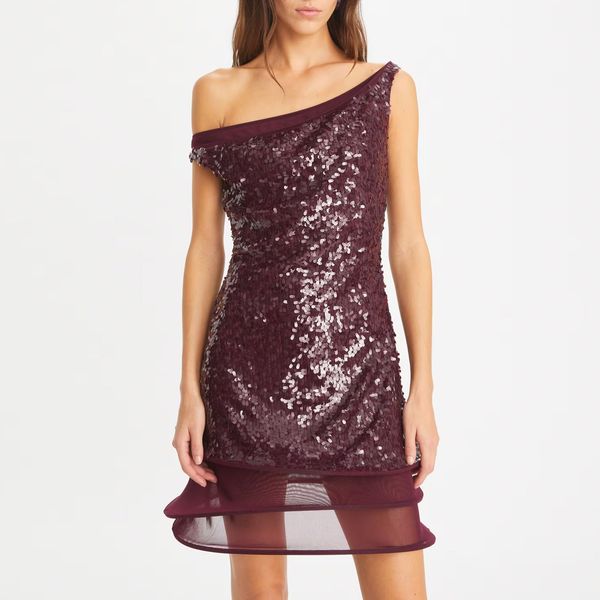 If you haven’t heard, burgundy is the color of the season. So look like a fine (sparkling) wine in this futuristic chiffon and sequin hoop mini dress.