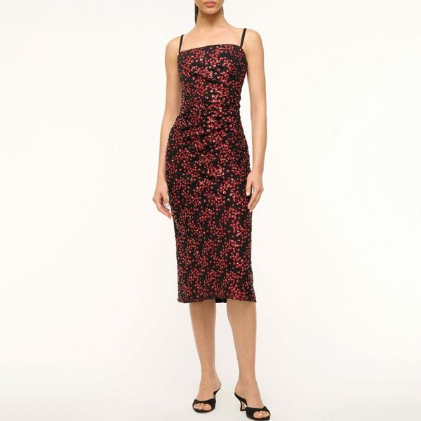 A different sparkle and chiffon option from above, this ’90s-style, square neck dress is adorned with red poppy-shaped sequins. You can complete the look with either the matching mules or bag (if you want to go all out).