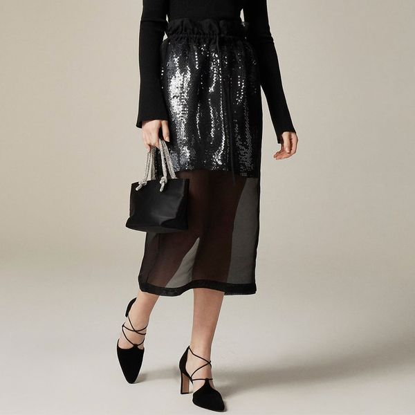 Sheer and sequins is the pairing of the moment, which is why we love this layer skirt design from J.Crew. The silver sequin skirt underneath (which is removable) paired with the black chiffon overlay is a versatile and vibrant skirt and with some flashy depth.