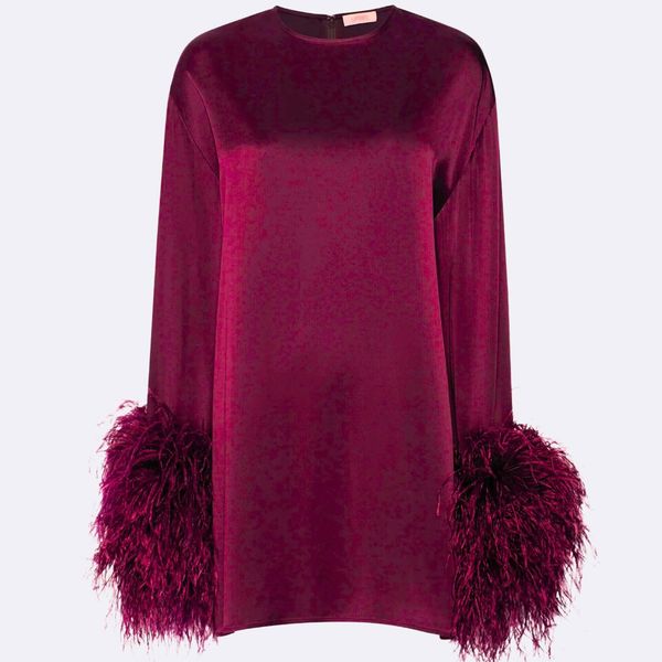 Who doesn’t love a sleek shift dress? Especially one that doubles as flouncy feathered top. Show some leg and wear this satin shift as a statement minidress or pair it with some satin pants for an elevated chic-sleep look.