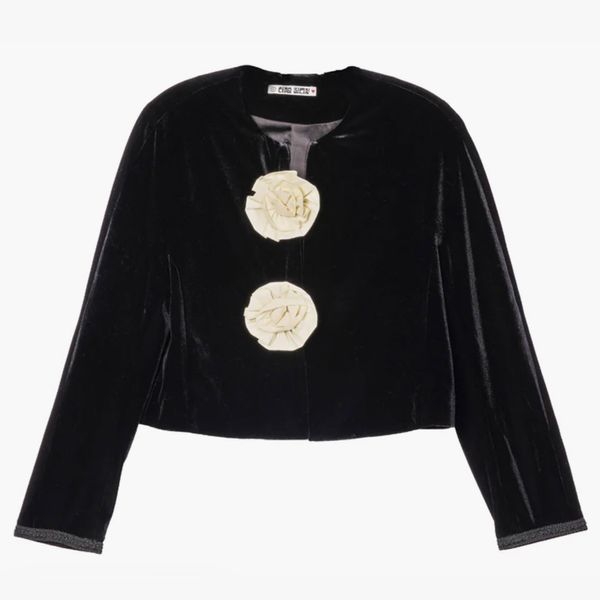Add an extra layer to your holiday look with a mini-jacket like this from Ciao Lucia. We love the contrast of the velvet jacket body with the large cream-colored rosettes. This is also a great piece that can transition from the holidays and into the later winter months.