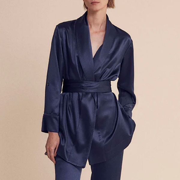 Think smoking jacket with an elegant twist. If you like the idea of loungewear that can be dressed up, you’ll love this robe-style jacket by Rose Room. It can be worn a number of ways: tied in the front, the back, or worn open with another layer, plus it can easily transition from the office to the party. Complete the look with the matching silk trousers.