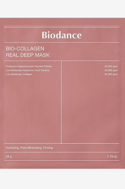 A staple of the routine, this collagen sheet mask seals in moisture overnight so you wake up with glassy skin. The mask is meant to be worn for over six hours and turns clear when it’s ready to remove.