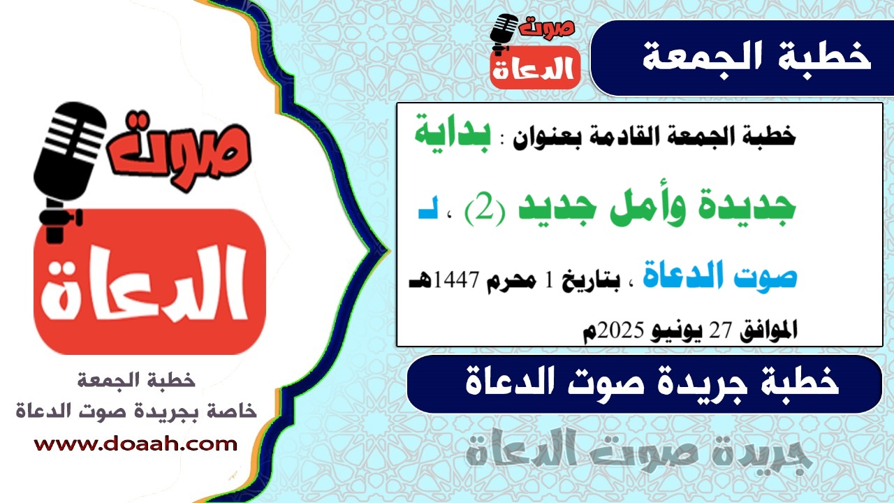 Next Friday sermon entitled: A new start and a new hopeTo Preacher On Muharram 1, 1447 AH, corresponding to June 27, 2025 AD.