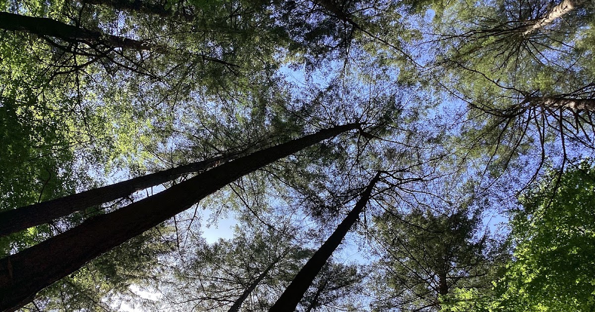 Photo by Sheila Webber of looking up to trees and sky in Stanley Park, Vancouver, May 2024