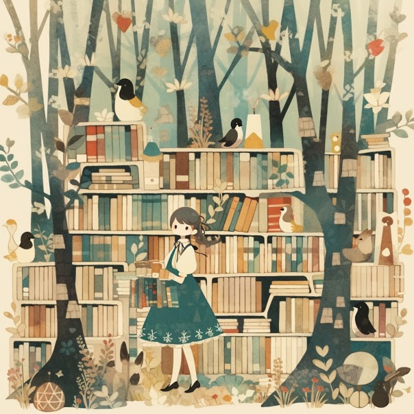 Image by Sheila Webber using Midjourney AI with prompt librarian heroine saving books in a forest — niji 5 cute
