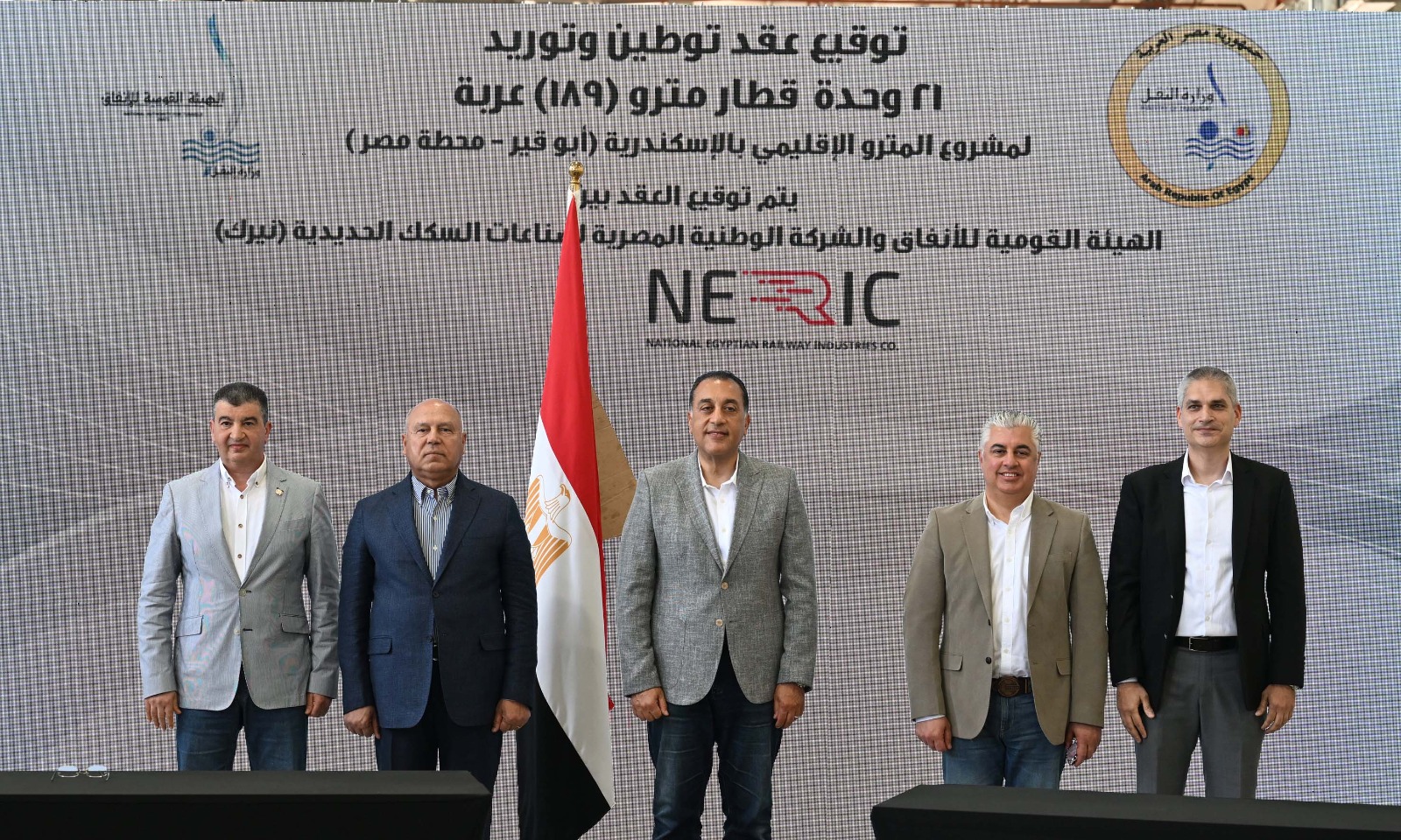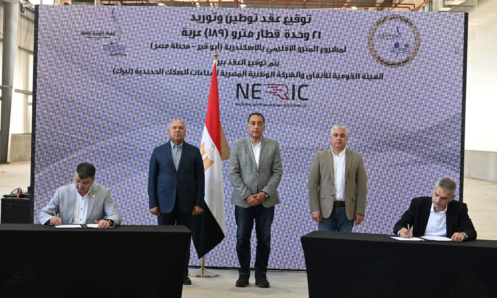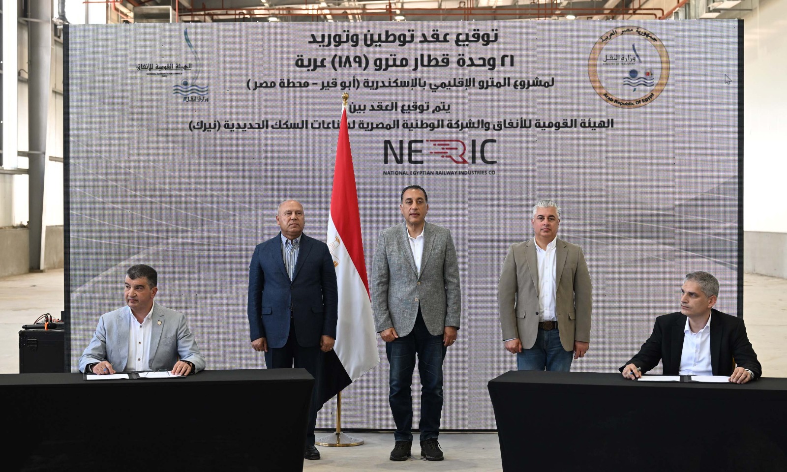 Dr. Mustafa Madbouli, the Prime Minister, during his visit to the Nirk Railway Industry Factory “Nirk” in the city of Bursa Said today, the ceremony of signing the contract agreement between 21 units and 189 vehicles in favor of the Alexandria metro project “Abu Qir – Misr Station”, in the presence of the General Engineer Kamel Al-Wizer, Deputy Prime Minister for Industrial Development, Minister of Industry and Transport, Woulid Jamal Al-Din, Chairman of the General Authority for the Economic Zone of the Swiss Channel.