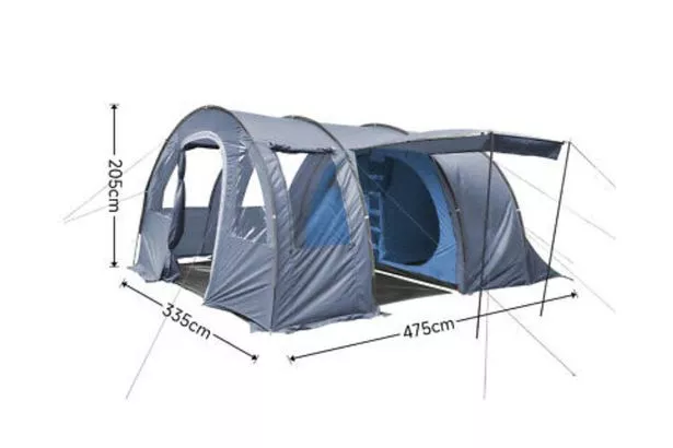 Due to its large size, this tent provides ample space for everyone and your belongings. Plus, it comes with a handy awning that can be pitched out and propped up on poles, providing a shaded place to sit back and relax outside while also remaining protected from the turbulent UK weather.