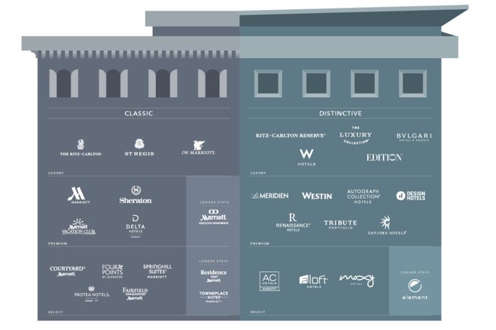 Don’t understand Marriott’s brands? Just check out the chart. They’re all either luxury, premium, or “select,” and they’re either classic (normal) or distinctive (quirky). Your regular Marriott is a “classic premium” hotel, while a hip W Hotel is “distinctive luxury,” and a value-priced Fairfield Inn is “classic select.”